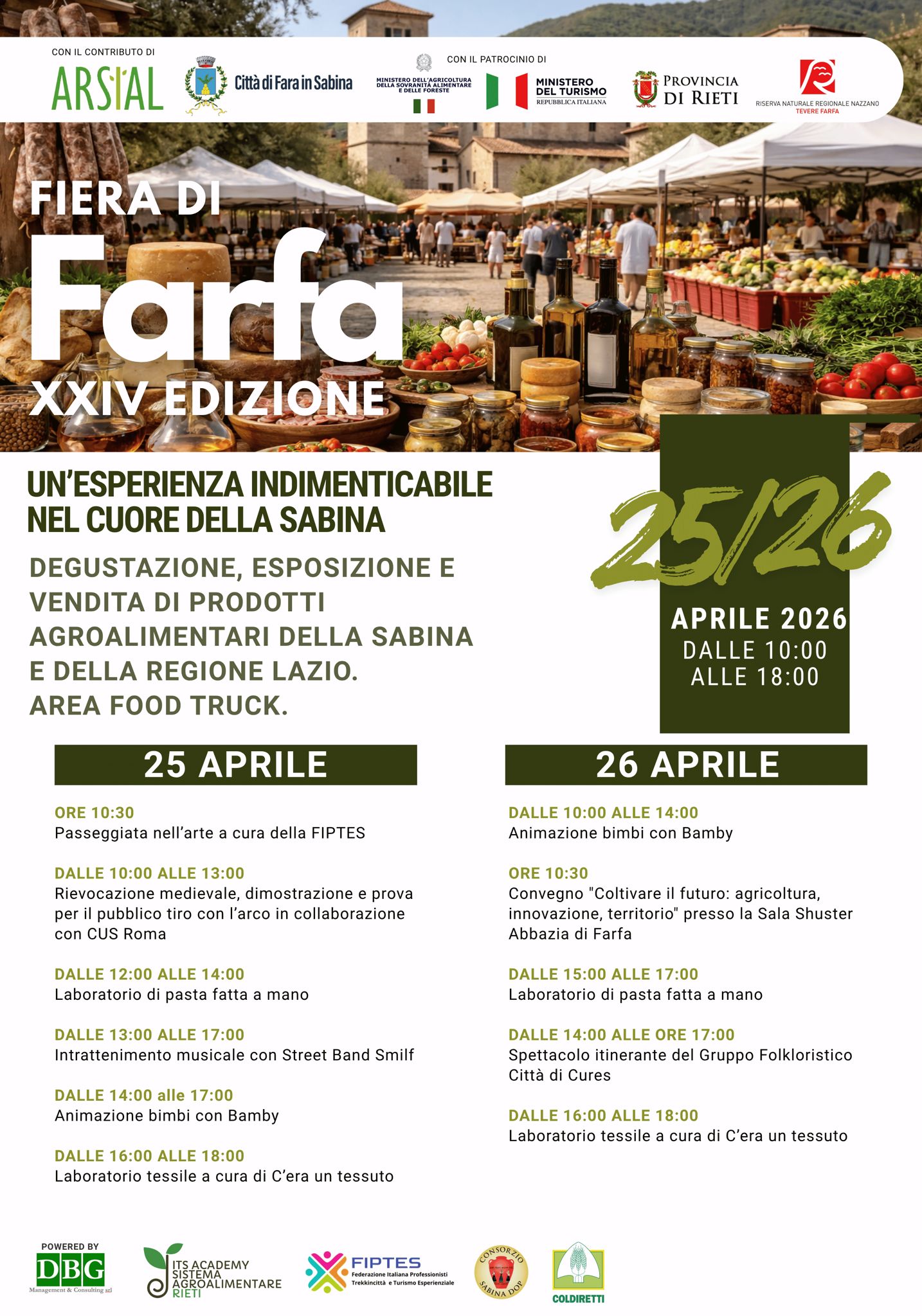 Il 26 aprile 2026 prosegue con una struttura simile, ma introduce un momento di approfondimento legato al futuro del territorio. Alle 10:30, presso la Sala Shuster dell’Abbazia di Farfa, si tiene il convegno “Coltivare il futuro: agricoltura, innovazione, territorio”. Un passaggio che collega la tradizione alle trasformazioni in atto nel settore agricolo.